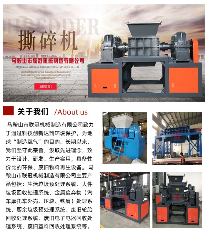 • 主營產品:工業固廢撕碎機,大件垃圾撕碎機,餐廚余垃圾撕碎機,金屬撕碎機